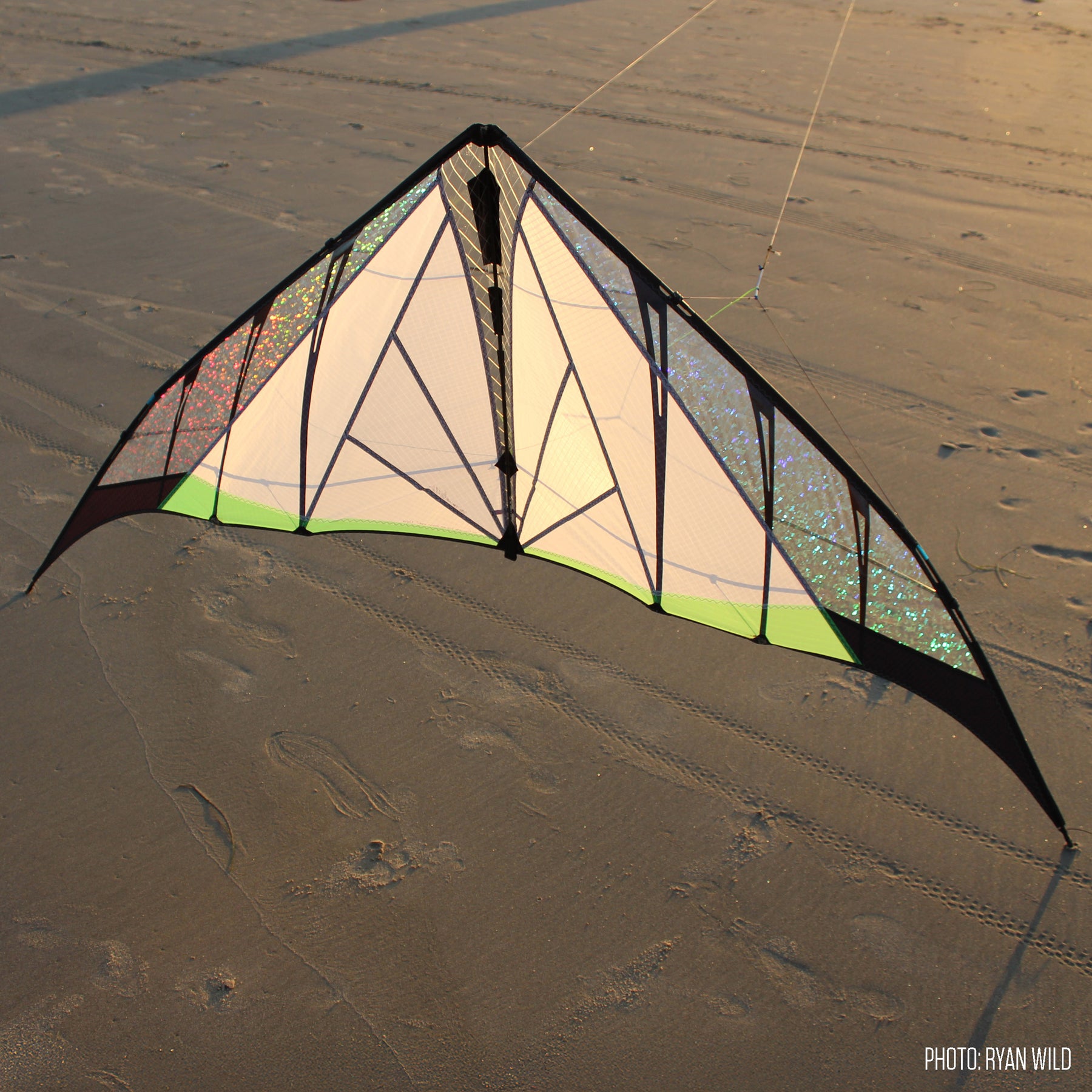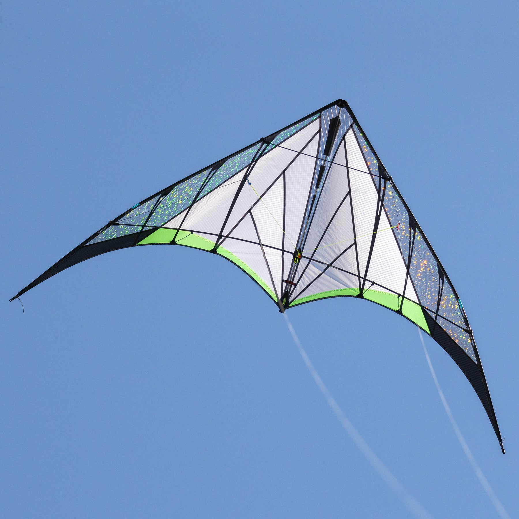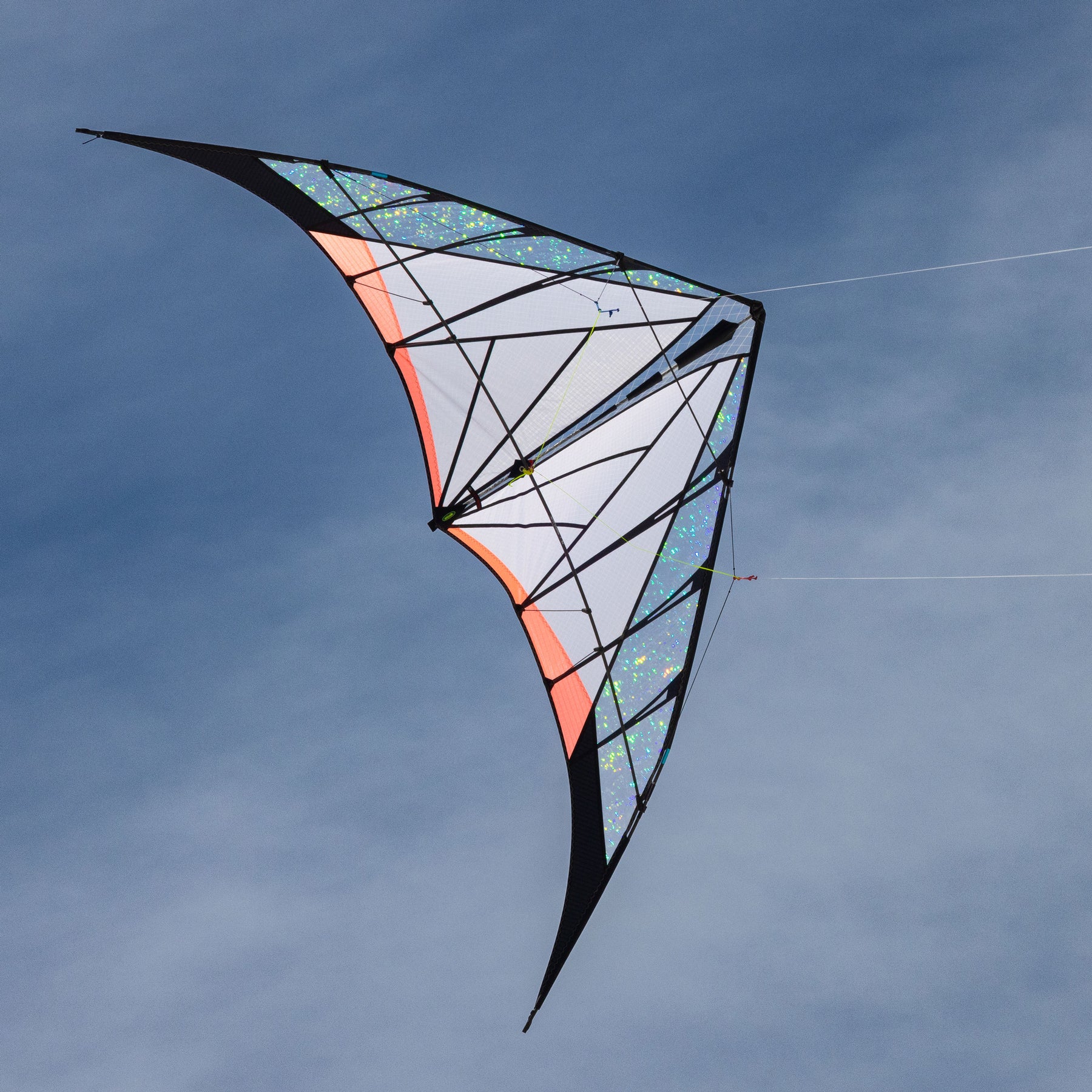 Optimized for balance and precision, it goes exactly where you point it and locks in without oversteer after every turn. It loves flat, graceful axels and flat spins. Flick a wrist for locked-in stalls and slides across the entire window. Pop a fade in smooth wind and it’ll sit there all day. The outer standoffs are adjustable to control lift and speed in different winds, and the floating center T lets you set turn radius and pull to your flying style. But be advised: when the sun comes out you may ignore the tricks and just fly lazy circles around the sun, mesmerized by the dazzling Prismatex magic.