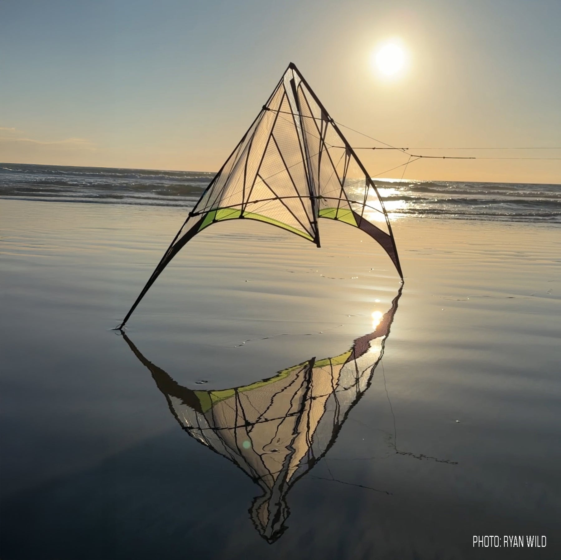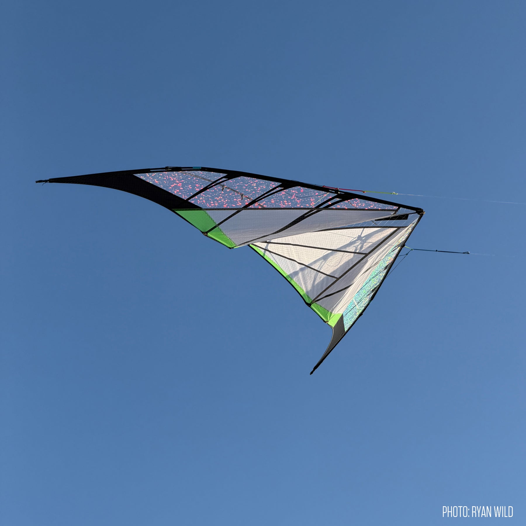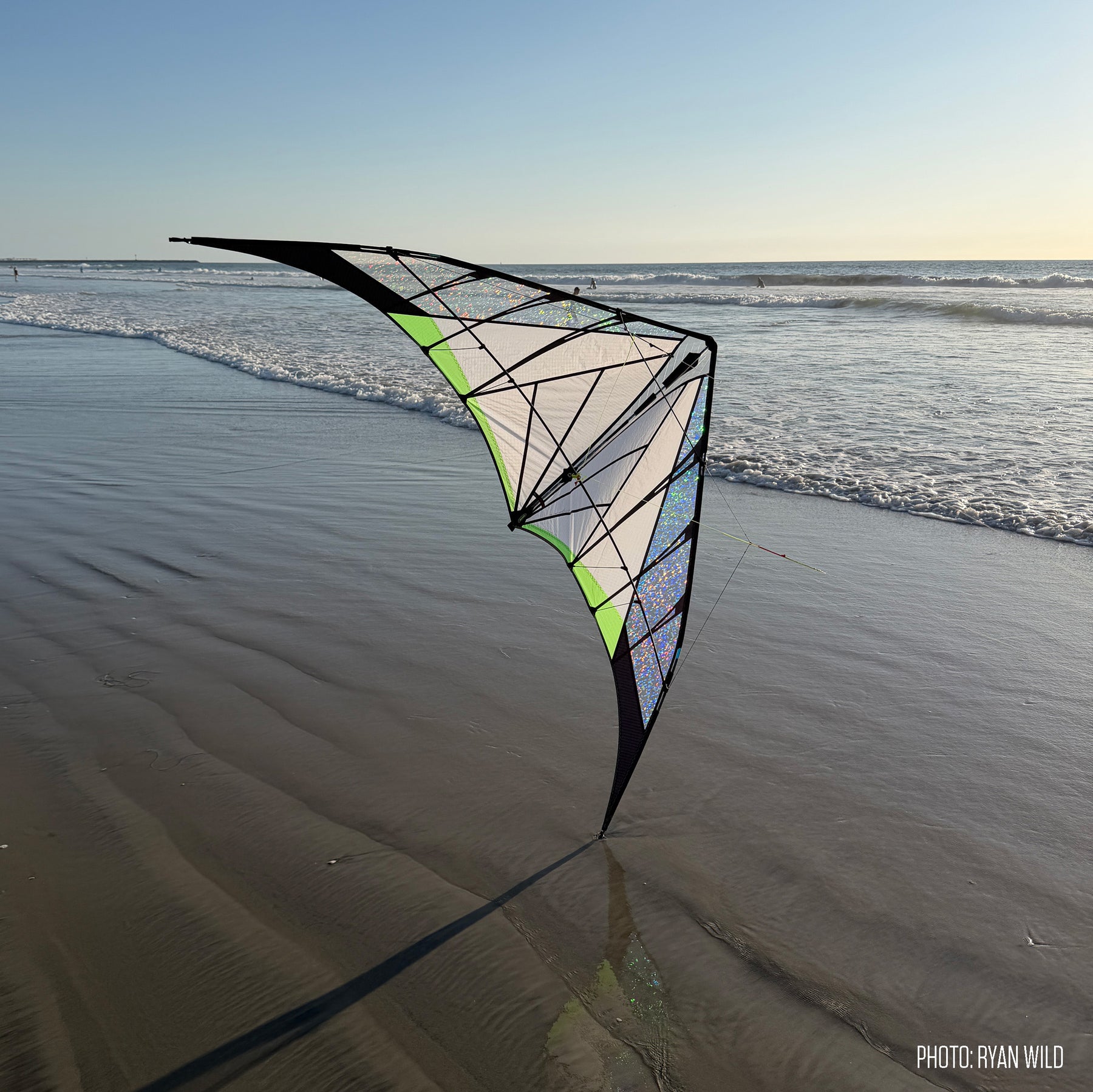 Optimized for balance and precision, it goes exactly where you point it and locks in without oversteer after every turn. It loves flat, graceful axels and flat spins. Flick a wrist for locked-in stalls and slides across the entire window. Pop a fade in smooth wind and it’ll sit there all day. The outer standoffs are adjustable to control lift and speed in different winds, and the floating center T lets you set turn radius and pull to your flying style. But be advised: when the sun comes out you may ignore the tricks and just fly lazy circles around the sun, mesmerized by the dazzling Prismatex magic.