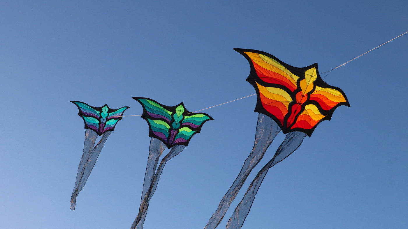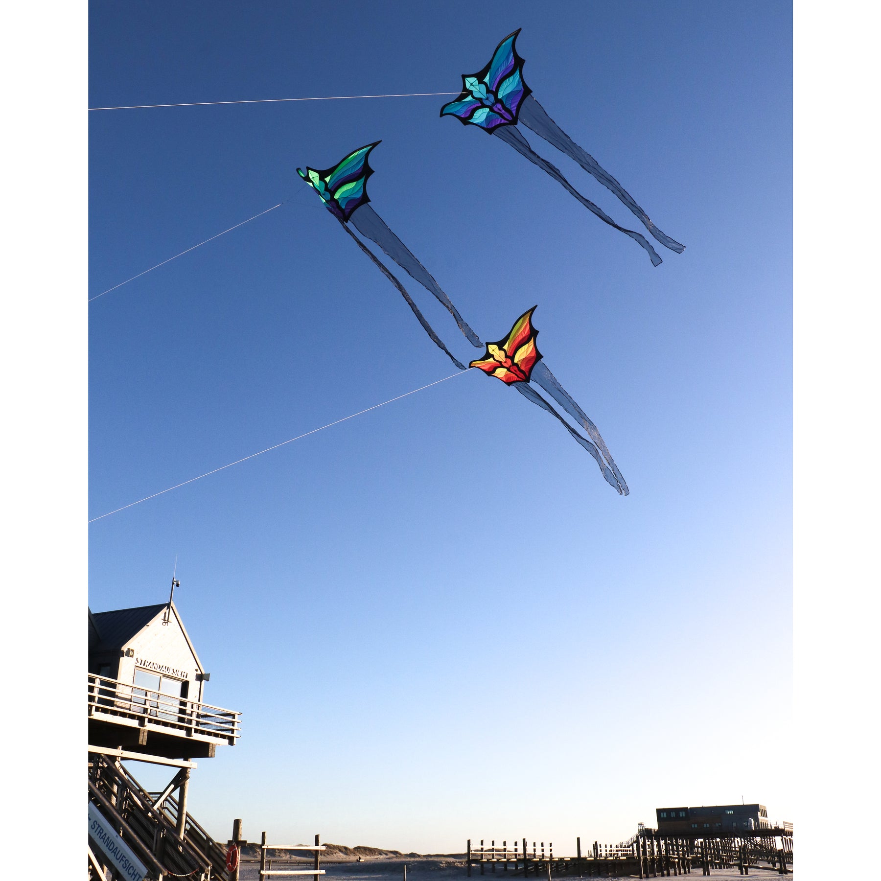 Created by Tasmanian artist Robert Brasington and produced by Spiderkites of Germany, this playful design combines a delicate, flowy look with a surprisingly robust build. The ripstop nylon sail and fiberglass frame make it sturdy enough to handle a broad wind range, while the nearly weightless 9-foot organza tails add motion and extra stability in shifting winds. Flown singly, the Butterfly provides a bold pop of color, with a graceful, lively presence in the air. When stacked together, multiple kites create a striking display that'll turn heads from a distance! Each kite includes a storage sleeve and flying line, plus pigtails and stack lines to fly more than one on the same line.